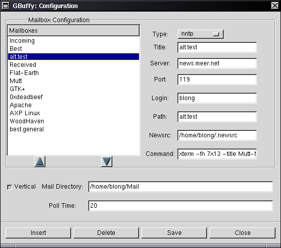 GBuffyGBuffy is a GTK+ multiple mailbox "biff" program. It is conceptually based on XBuffy by Bill Pemberton, but is a complete rewrite from scratch.GBuffy will poll multiple mailboxes for new mail. It will list the number of new messages in each mailbox you configure. It will also highlight the mailboxes which have new mail. Pressing the left mouse button on a mailbox with new mail will display the Sender and Subject of each new message. Additionally, GBuffy will display the X-Face header for messages which have them. Pressing the middle mouse button on a mailbox will launch the configured command, generally a command to read the mailbox with your favorite mailreader. Pressing the right mouse button will bring up the configure menu. GBuffy is currently capable of watching MBOX, MMDF, Maildir and MH Folders. This version also supports IMAP4rev1 and NNTP with XOVER mailboxes. Support for an external program for notification is planned. The main advantages of GBuffy over XBuffy are: